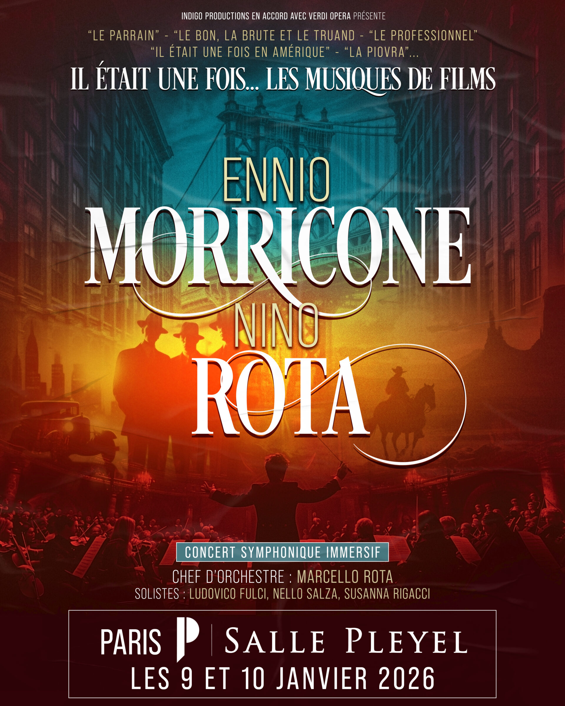 Sous la direction de Marcello Rota, chef d’orchestre de renommée internationale et neveu de Nino Rota, les célèbres solistes Nello Salza (trompette), Ludovico Fulci (piano) et Susanna Rigacci (soprano), qui ont collaboré pendant plus de 30 ans avec Ennio Morricone avec plus de 500 concerts à travers le monde, interprètent des pièces magistrales du répertoire. Vivez les moments clés de leurs carrières exceptionnelles à travers les musiques de films de Sergio Leone (Le Bon, la Brute et le Truand, Il était une fois dans l’Ouest…), Francis Ford Coppola (Le Parrain…) ou encore Federico Fellini (La Strada