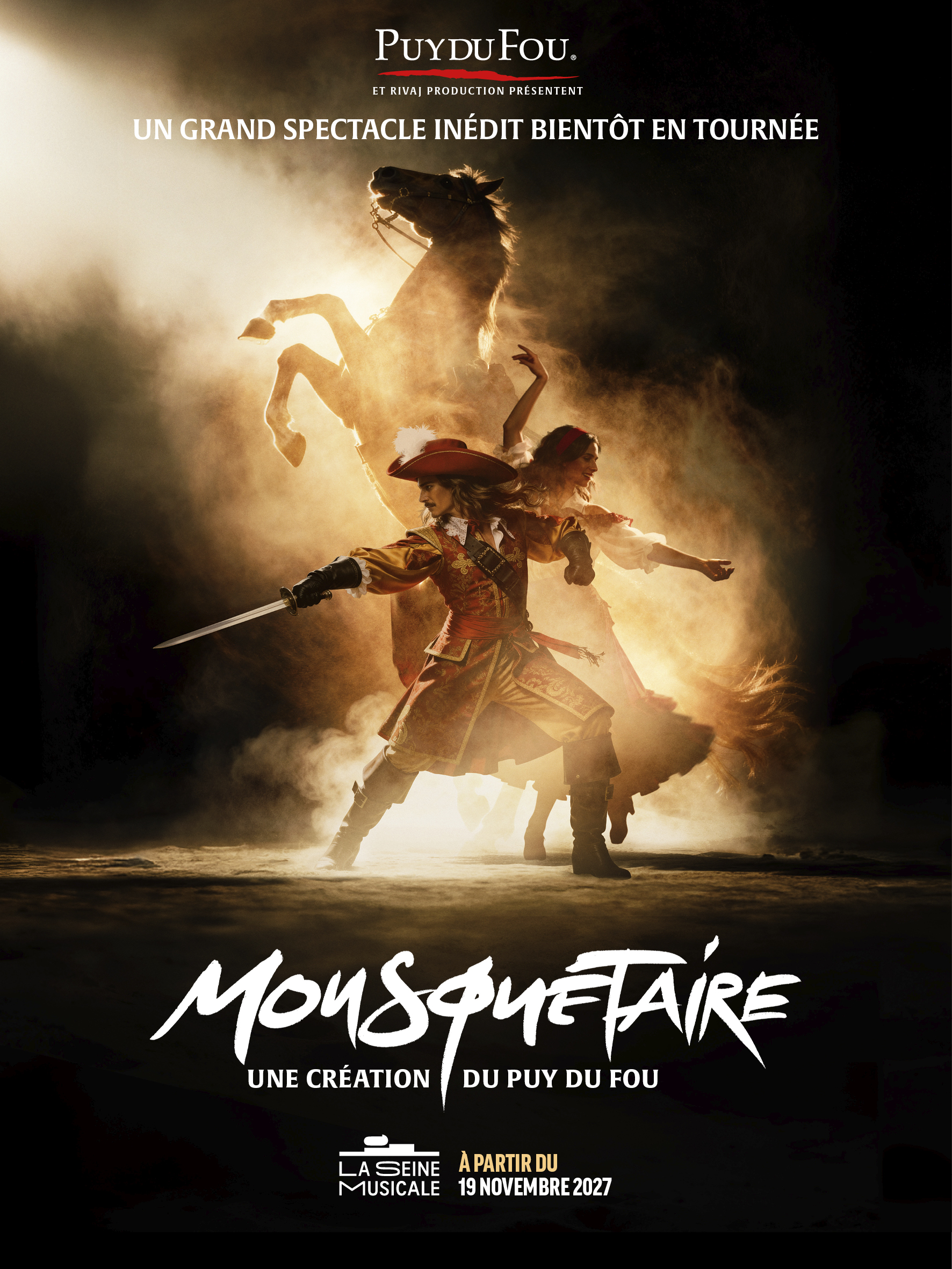 Le Puy du Fou dévoile Mousquetaire coproduit par le Puy du Fou et RIVAJ Production. Ce spectacle inédit sera présenté pour la première fois à la Seine Musicale en novembre 2027 puis ira à la rencontre du public dans toutes les villes de France dès janvier 2028. Fidèle au savoir-faire du Puy du Fou, cette création inédite proposera une expérience unique dans la continuité de l’exigence artistique et technique qui distingue ses plus grandes réalisations. S’y mêlent aventures héroïques, combats, danse et scènes équestres servant une intrigue palpitante. Rythmé par une bande originale puissante créée par le compositeur Nathan Stornetta, ce spectacle épique réunit tous les ingrédients qui satisferont les amateurs de grand spectacle.