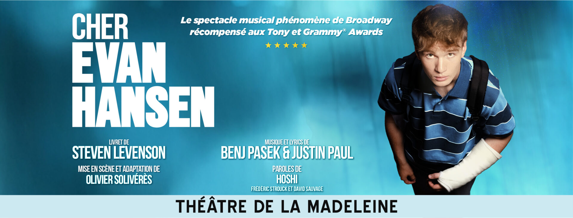 Un spectacle musical qui aborde avec justesse et sensibilité des thématiques devenues cruciales : le mal-être adolescent, l’anxiété sociale, l’isolement et l’impact des réseaux sociaux sur les jeunes. Multi-récompensé à Broadway et à Londres, CHER EVAN HANSEN sera au Théâtre de la Madeleine. Le personnage principal, Evan Hansen, lycéen de 17 ans, se retrouve au centre d’un drame qui l’expose soudainement au regard des autres, soulevant une question universelle : jusqu’où peut-on aller pour être vu, aimé, reconnu ?